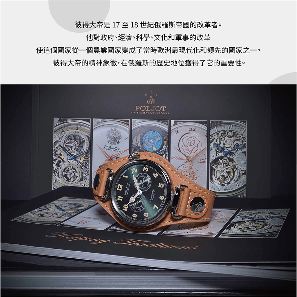 奧爾洛夫伯爵錶所用的機芯是一種特殊的鏤空機芯,與其他機芯不同。製錶師透過多年工藝,謹慎地完成並調整到高端質量標準,使這款腕錶非常堅固和可靠。對於錶殼,採用傳統和著名的 Poljot-International 經典不鏽鋼錶殼,鱷魚外觀的小牛皮錶帶使錶款看起來更加精緻和奢華。