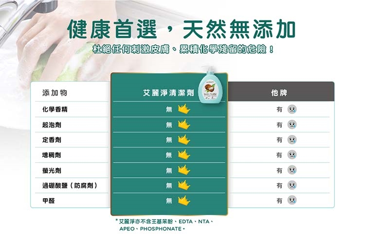 使用方式: 蔬果清潔時可加入少量清潔露 浸泡5-10分鐘 再以清水沖洗