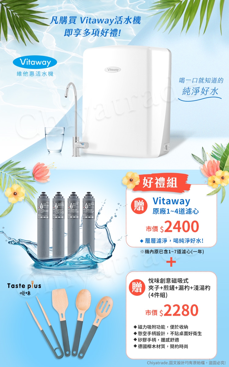 總濾淨量:半年用水量達4300公升,更換1-4道濾心;一年用水量達8600公升,更換1-7道濾心。