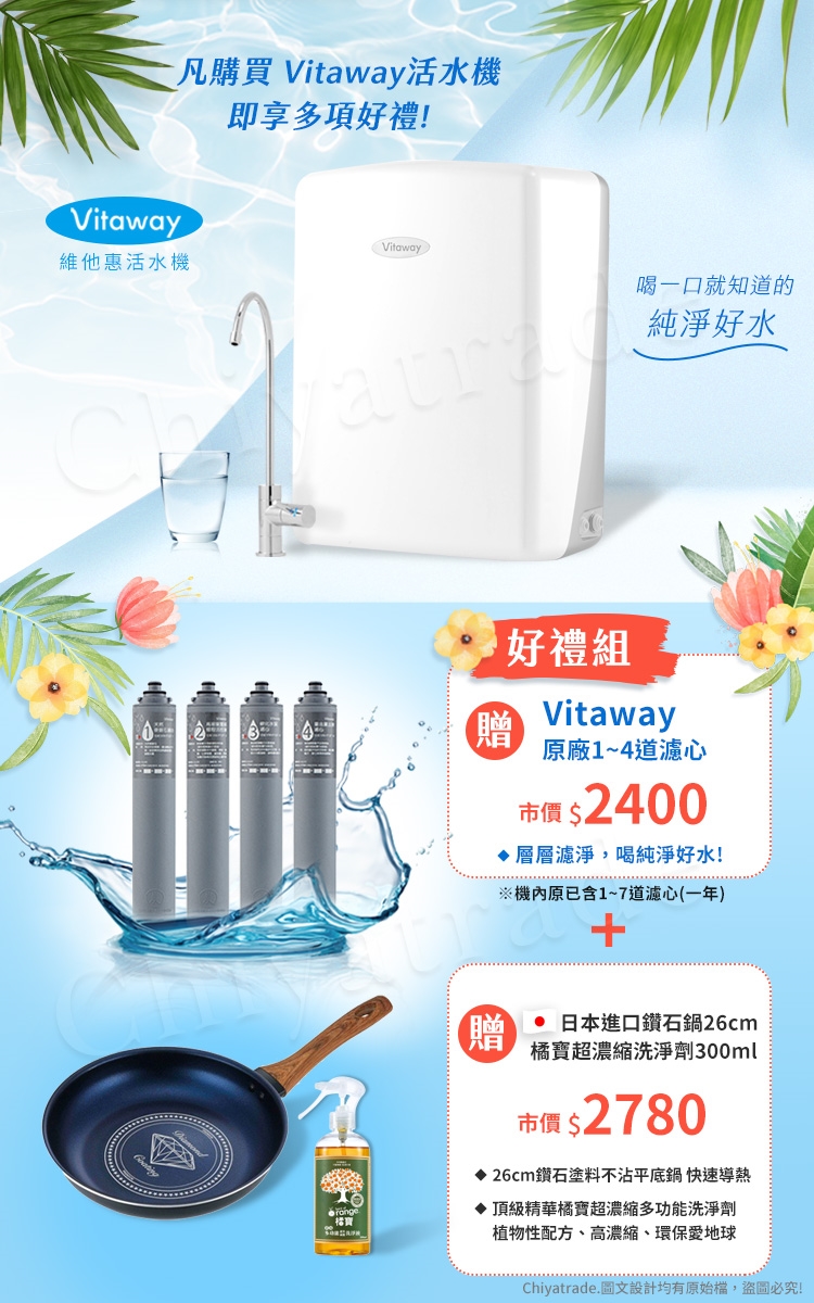 總濾淨量:半年用水量達4300公升,更換1-4道濾心;一年用水量達8600公升,更換1-7道濾心。