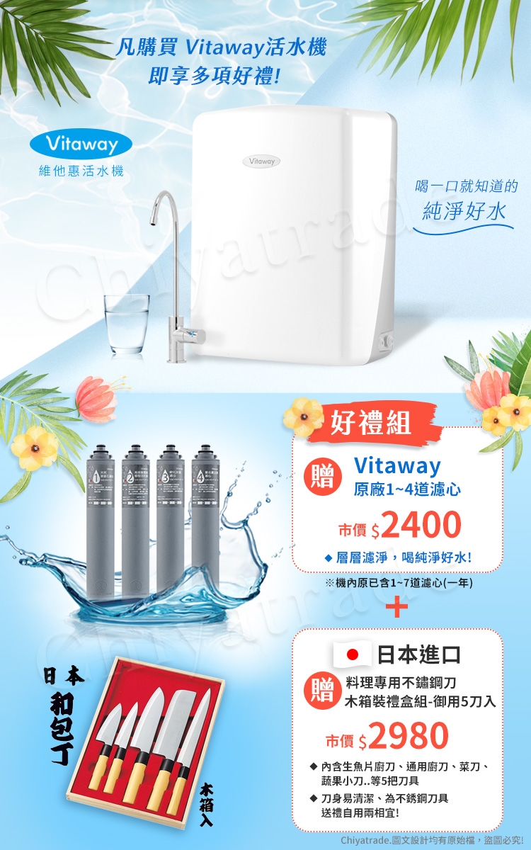 總濾淨量:半年用水量達4300公升,更換1-4道濾心;一年用水量達8600公升,更換1-7道濾心。