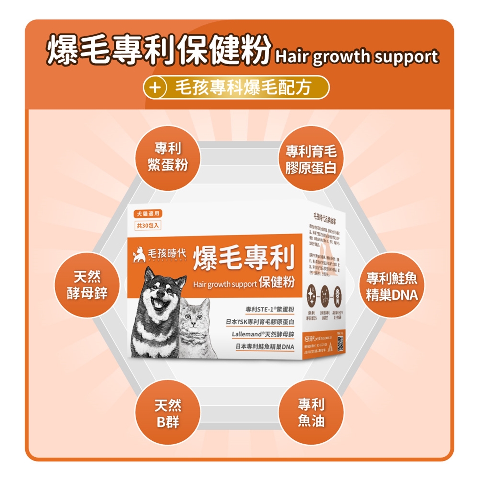 1、毛孩時代的「爆毛專利保健粉」主成分有哪些呢?