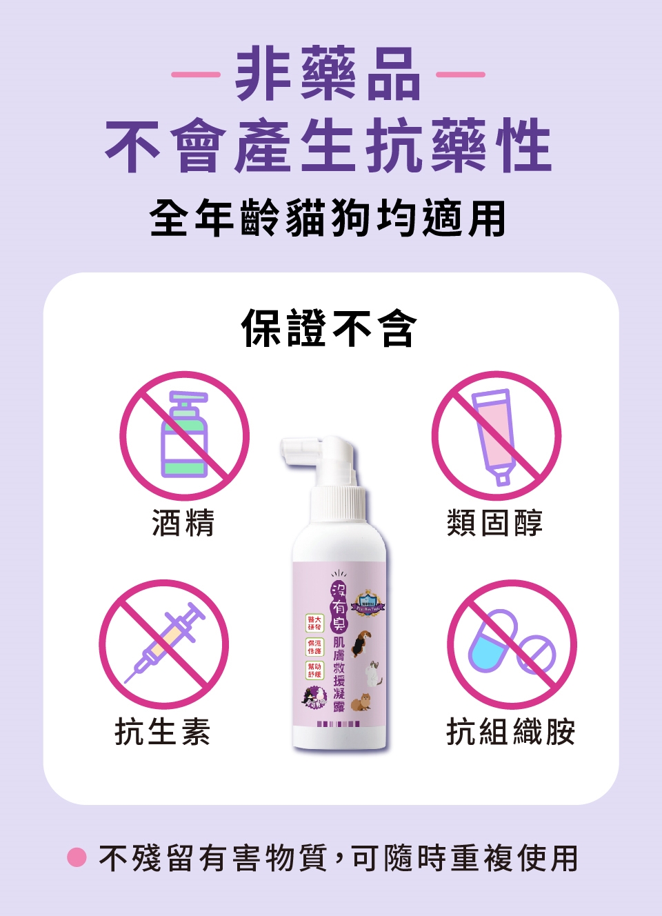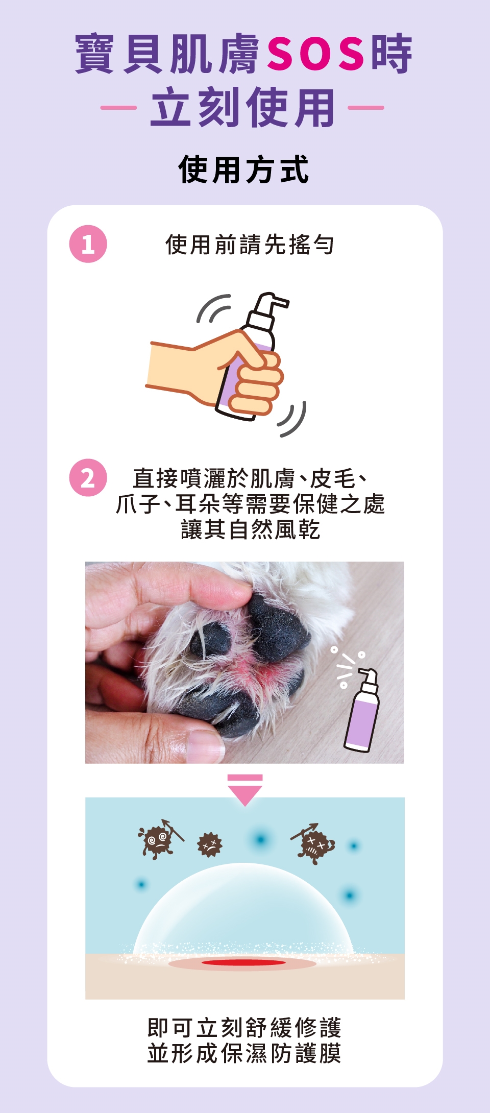 商品詳細介紹 使用方法說明 主要成分:Plus Bio-Tech電解氧化凝膠。非漂白水,不含酒精、三氯沙、氯己定、四級氨與化學香料等成分。保存期限:二年產品用途:幫助解決寵物皮膚不適。 注意事項 保存方法:請放置陰涼處,避免高溫環境及陽光直曬。開封後建議盡速使用完畢,使用後蓋緊瓶蓋。