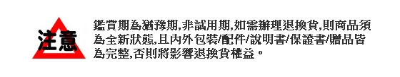 商品不提供試用 鑑賞期為猶豫期 退貨需保持商品全新狀態