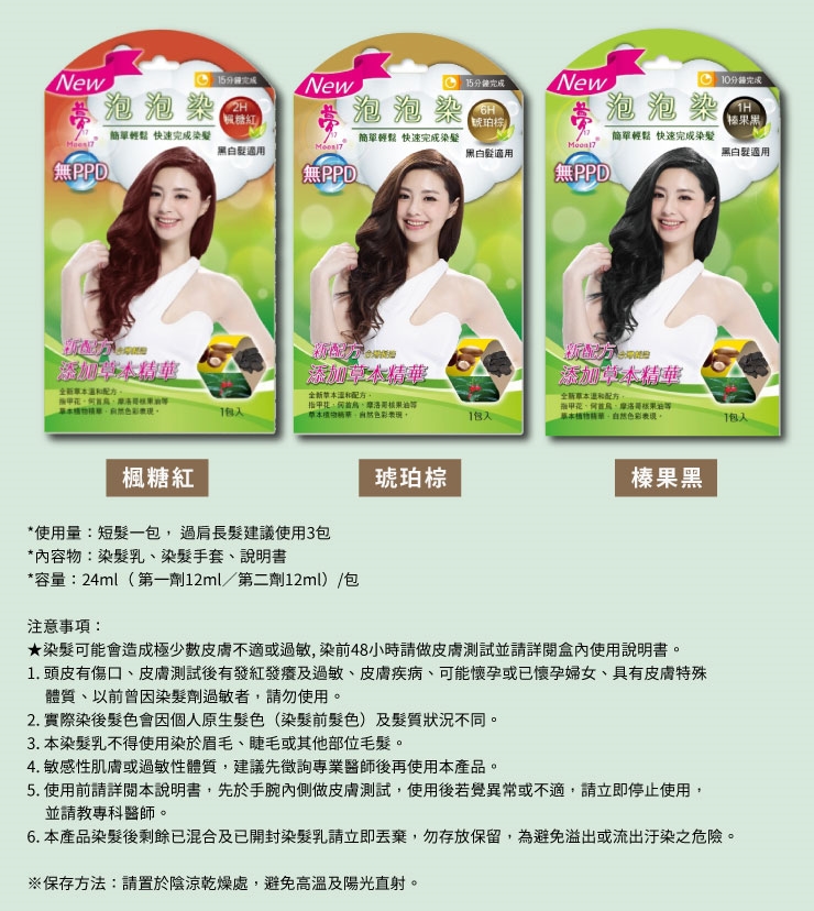 2.實際染後髮色會因個人原生髮色(染髮前髮色)及髮質狀況不同。