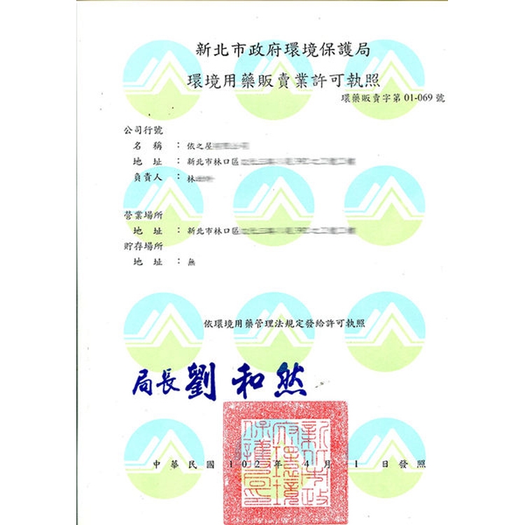 環境用藥販賣合格證書字號:環署訓證字第JS0010015號 (依之屋有限公司)