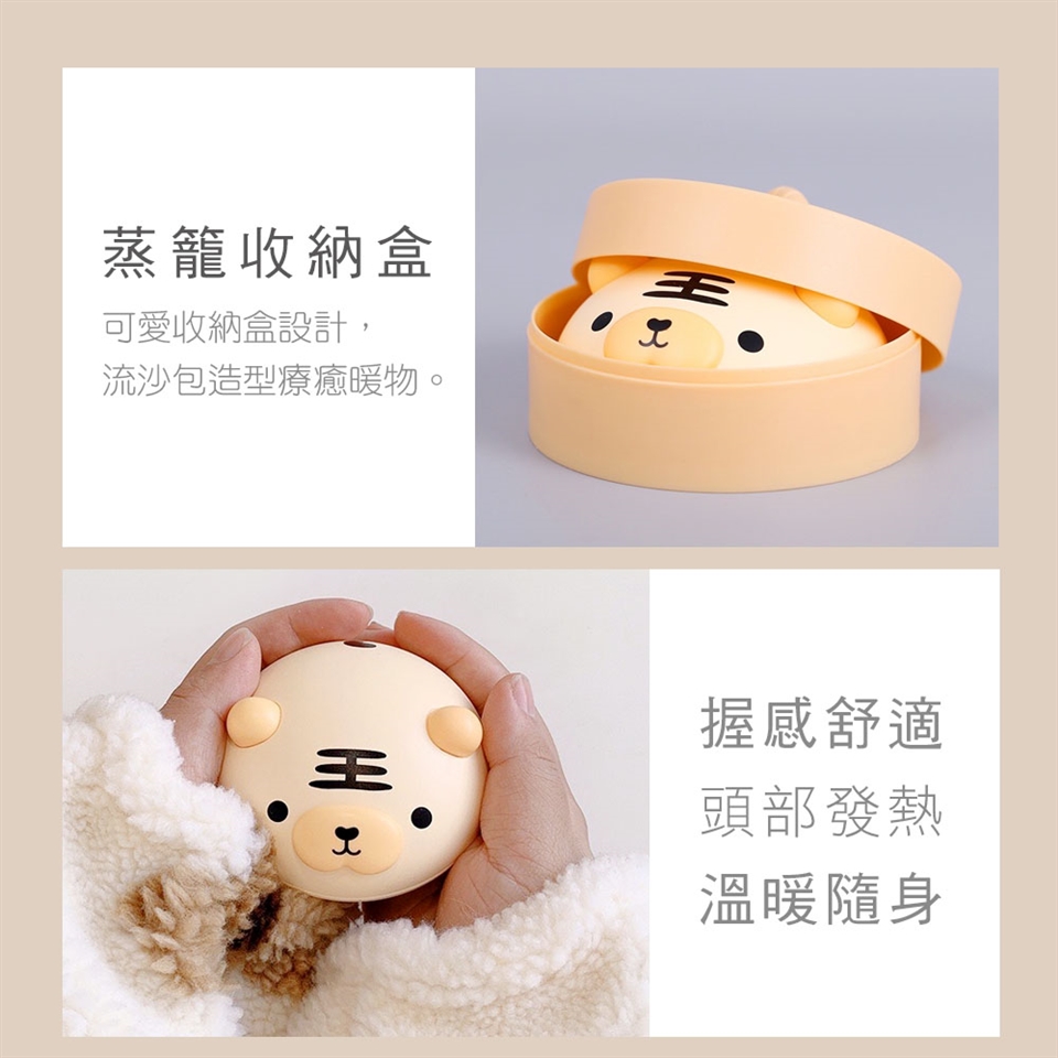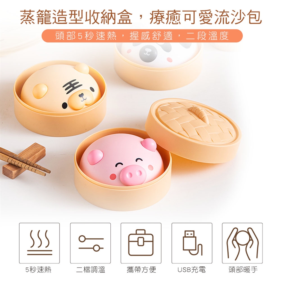 可愛造型USB充電式暖手寶,蒸籠造型收納盒,療癒可愛流沙包,頭部發熱設計,5秒速熱,二段溫度穩定不燙手,冬天隨時暖手,握感舒適。