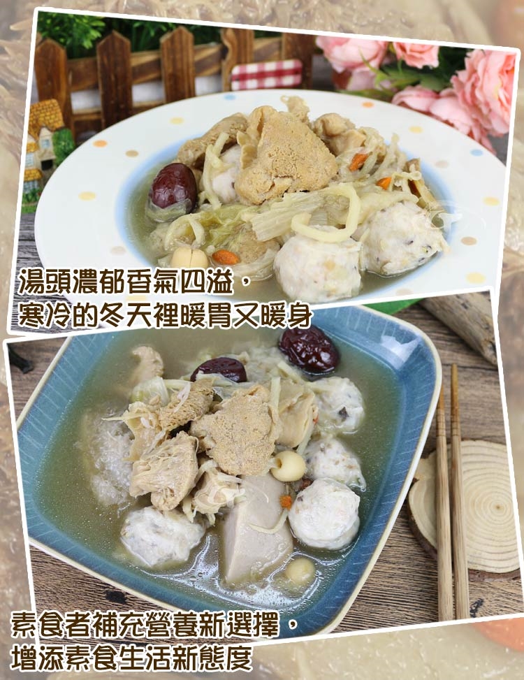 商品成份: 水、植物性大豆蛋白纖維[大豆蛋白(非基因改造)、小麥澱粉、小麥蛋白、碳酸鈣、硫酸鈣]、猴頭菇、蒟蒻丸子、芋頭、白菜、筍絲、薑片、蛋白粉、 栗子、枸杞、紅棗、蓮子、糖、鹽、當歸、甘草