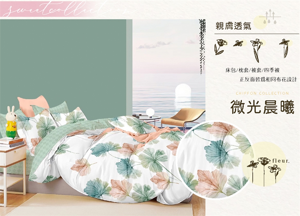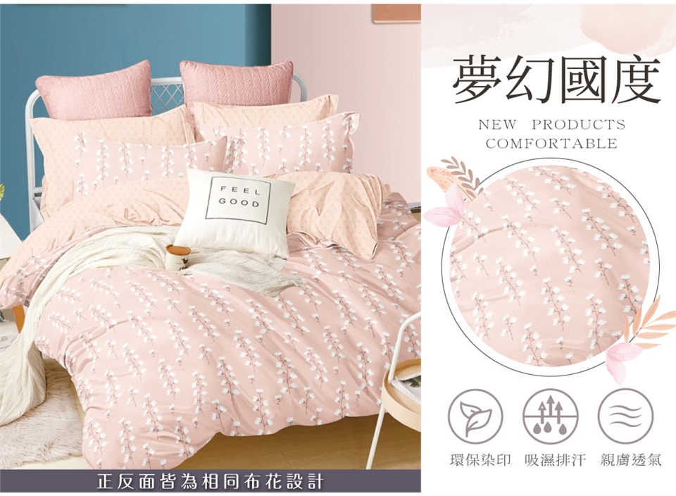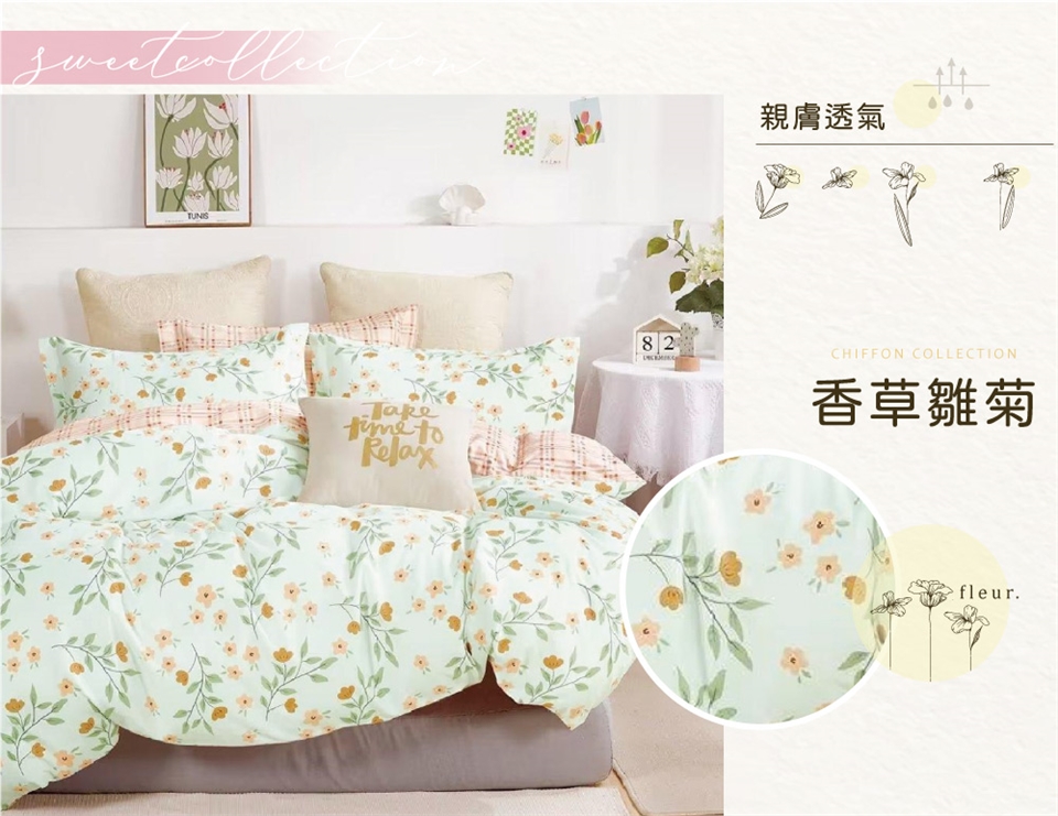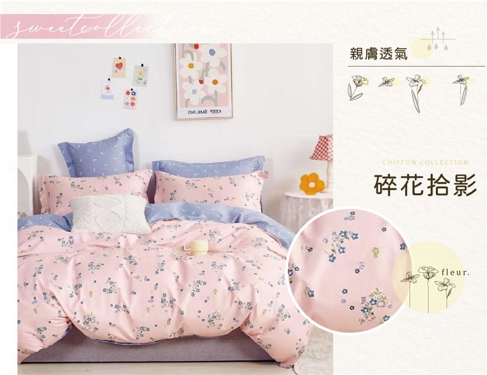 ※ 本商品圖為參考用之情境圖示,布料因裁切位置的不同,枕頭套、床包、被套部份花版可能會與照片之情境圖有所出入,請詳看內文說明。