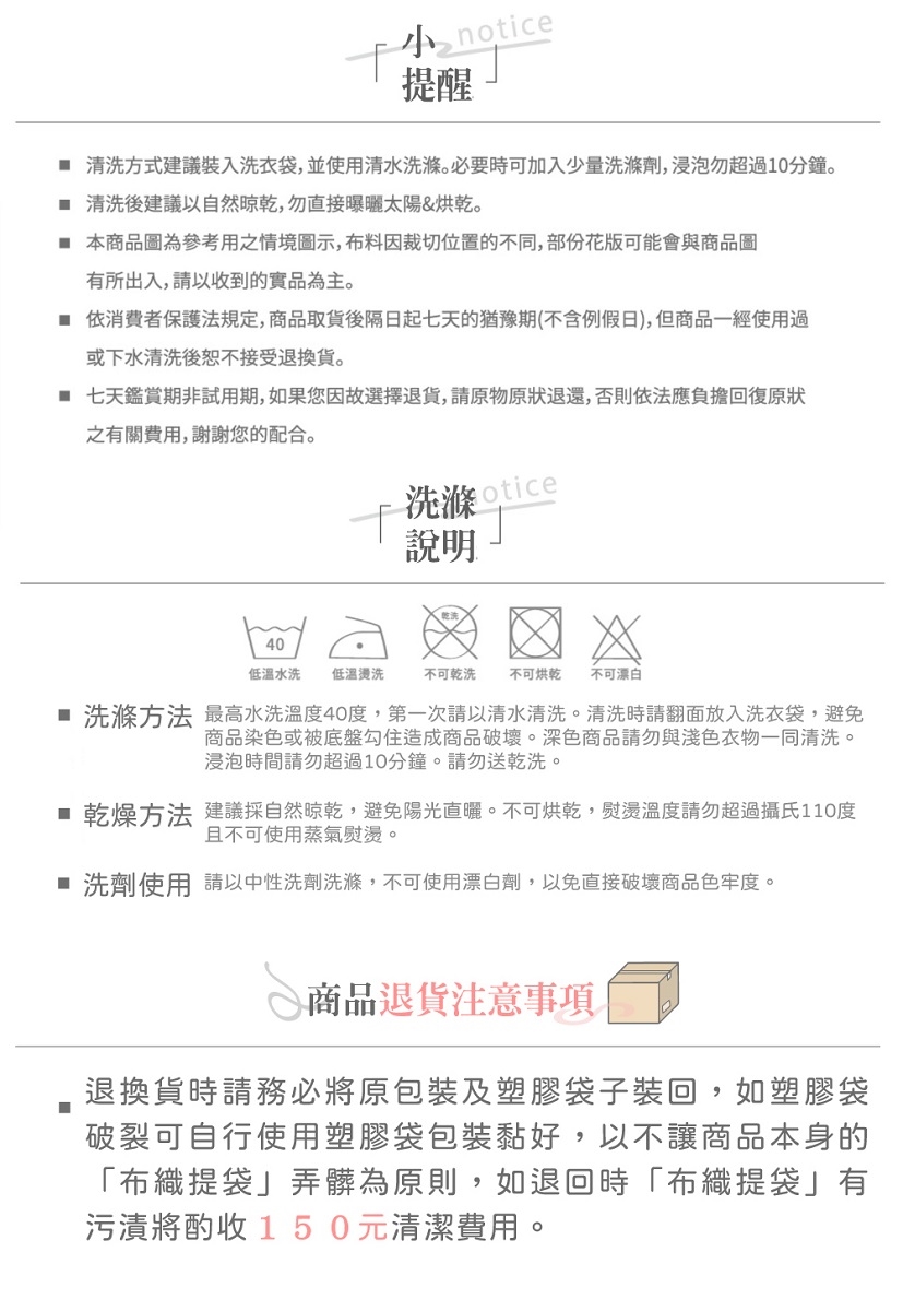 ※清潔保養方式可水洗/不可烘乾/不可漂白/勿使用強力漂白清潔劑/浸泡時間請勿超過30分鐘/建議可放入大型洗衣袋後再清洗。