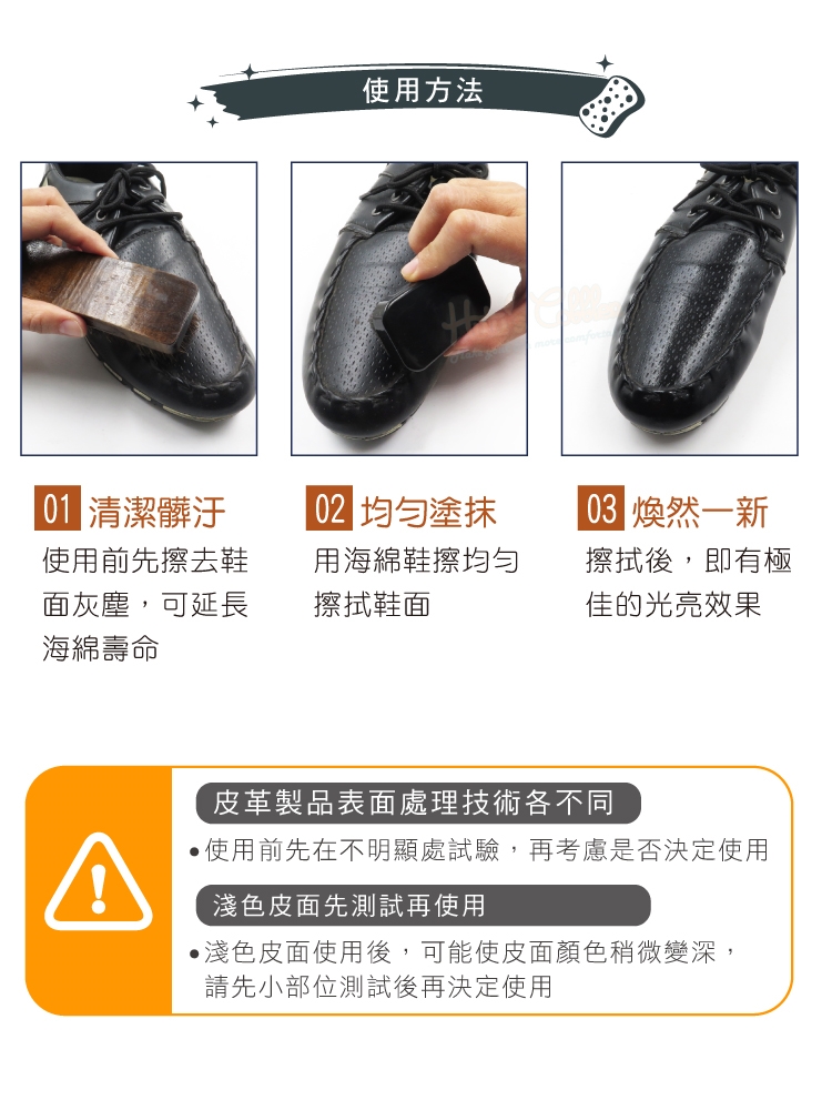 1.使用前先擦去鞋面灰塵,可延長海綿壽命