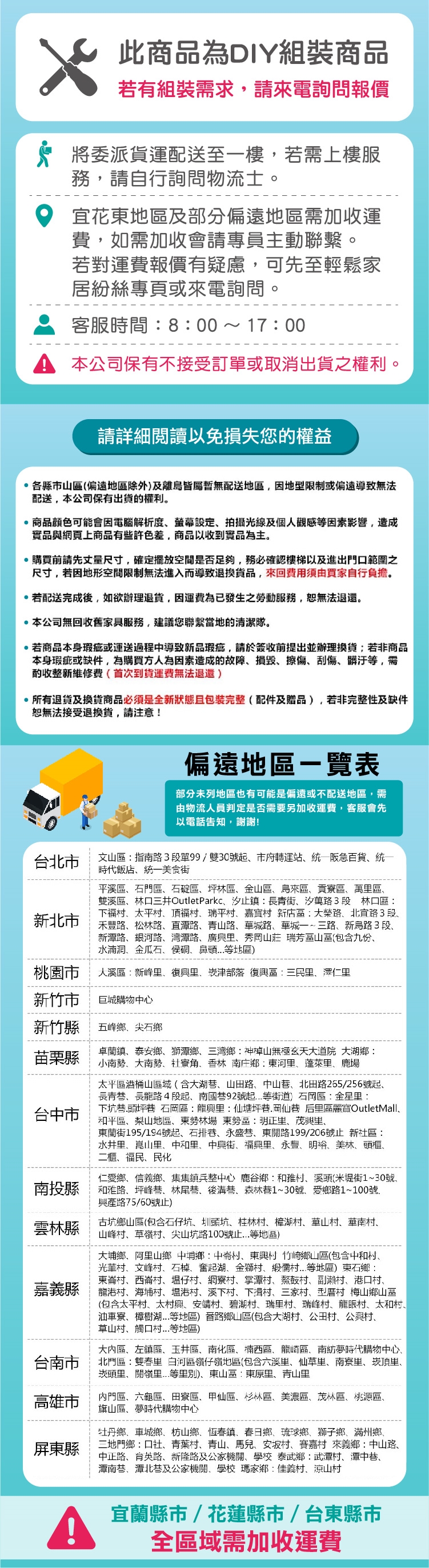 ※ 請於購買前先行測量空間大小、距離、商品尺寸,大型物件因人工丈量,難免會有些誤差值約正負0.5cm左右,詳細尺寸以實品為主,以免造成爭議,若因無法搬上樓而造成退貨,將酌收勞務費1500元。