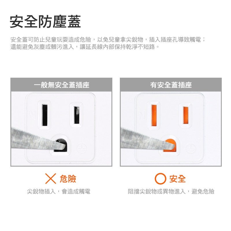 ‧ 防塵蓋可避免孩童觸摸插孔及防止灰塵進入