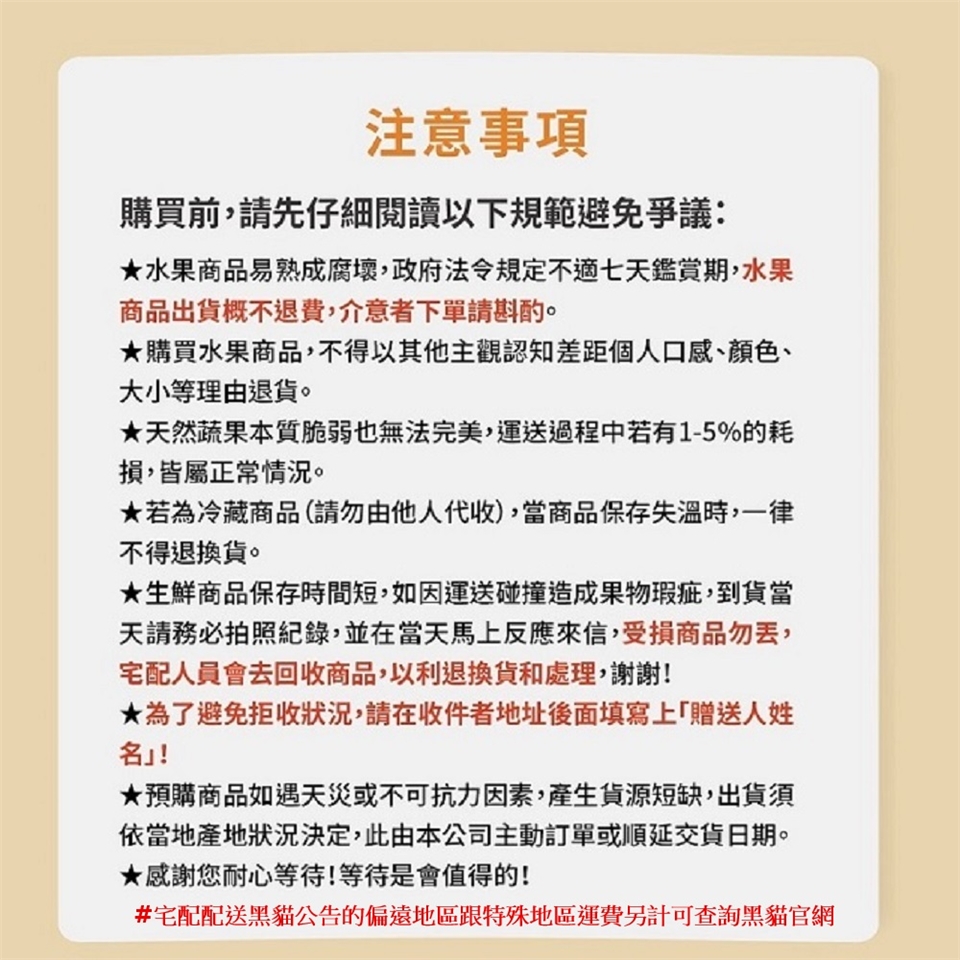 水果商品根據消保法規,不適用於7天鑑賞期退貨。 商品標示規格、重量、等級裝箱配送不得以其他主觀認知差距個人口感、顏色、大小等理由退貨。 如配送中產生損壞請立刻通知(當天),並拍照處理,將進行退換貨作業,逾期將影響您的退貨權益。