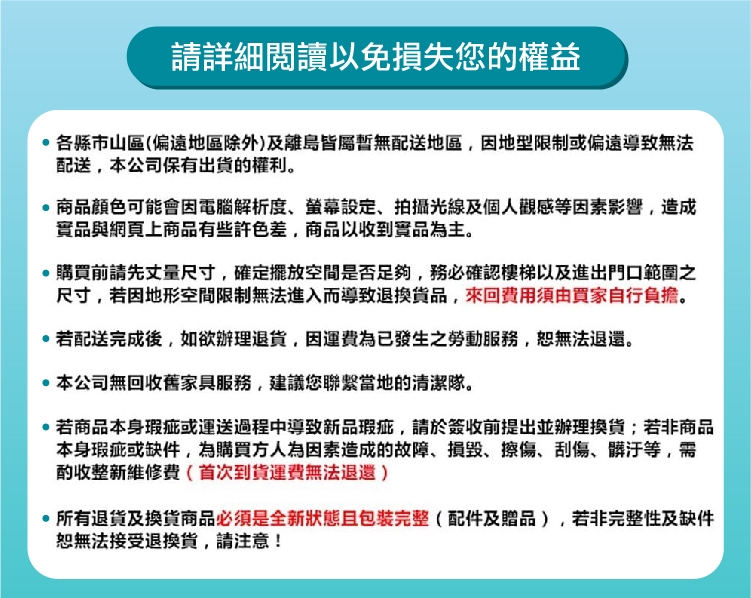 ※ 由於傢俱屬於大型物件,需要動用到大型貨車及商品保護包裝搬運等過程緊瑣,除非商品本身有瑕疵,恕無法辦理退換貨,若仍需辦理退貨則須負責退貨運費支付及整新費用$1500元。