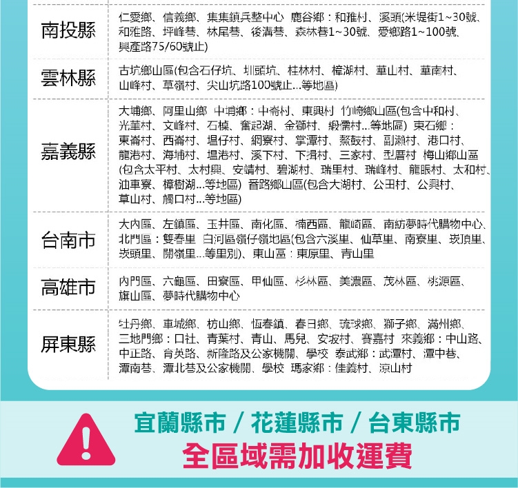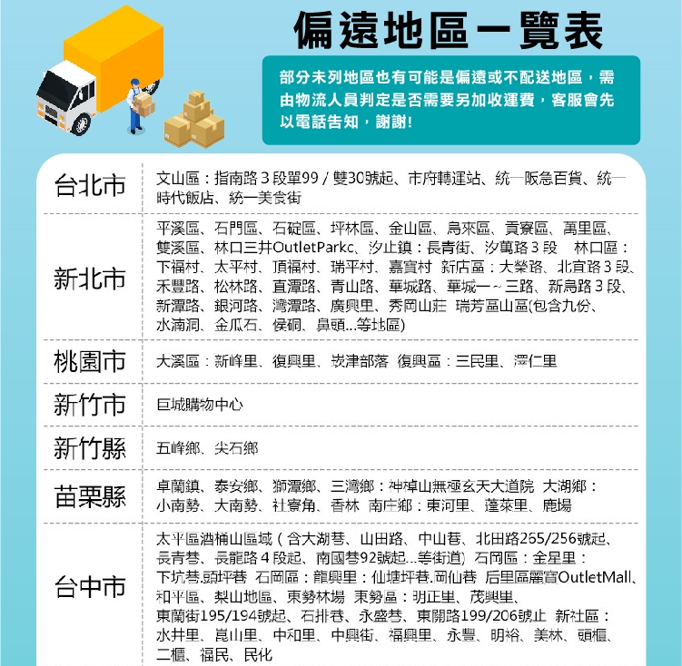 ※ 部分地區因地形限制及屬於偏遠地區將無法配送(請參考下圖)。