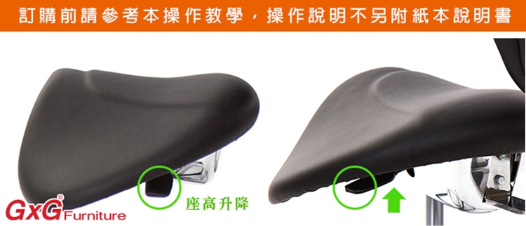 高度調整︰調整高度時,人請先離開座墊,請向上拉坐墊前緣的圓盤拉桿,即可將座墊昇起,若需調降高度,人則需坐在座墊上,請向上拉坐墊前緣的圓盤拉桿,透過身體重量,座面高度即可下降。
