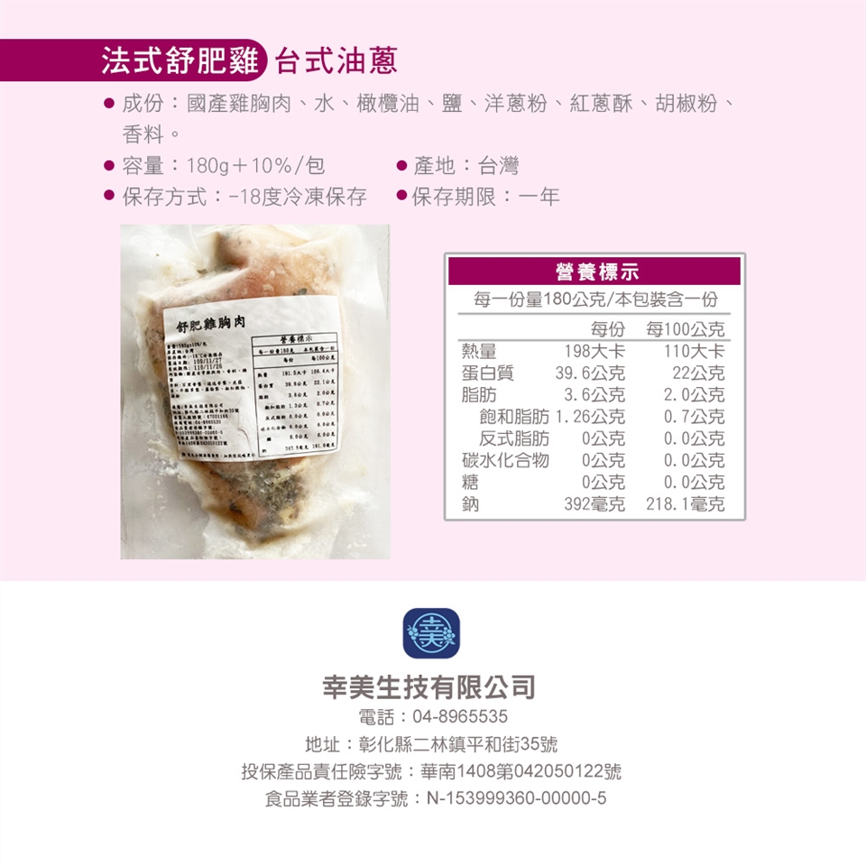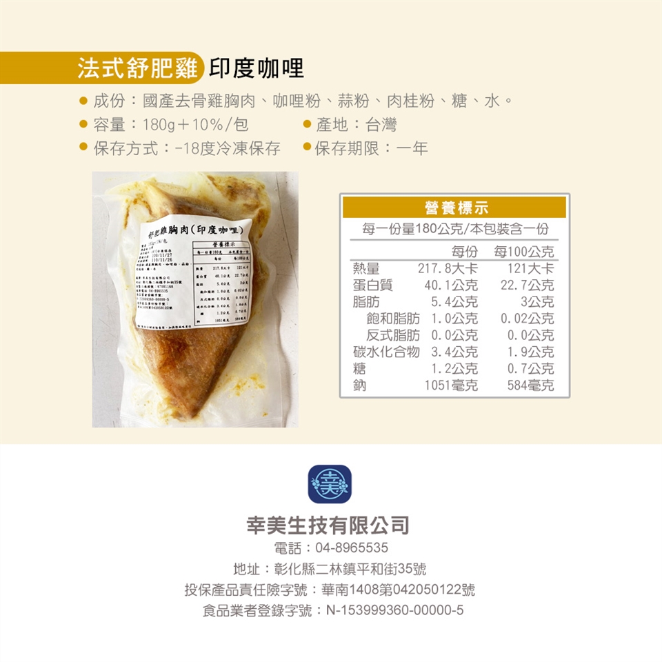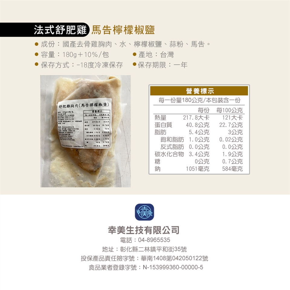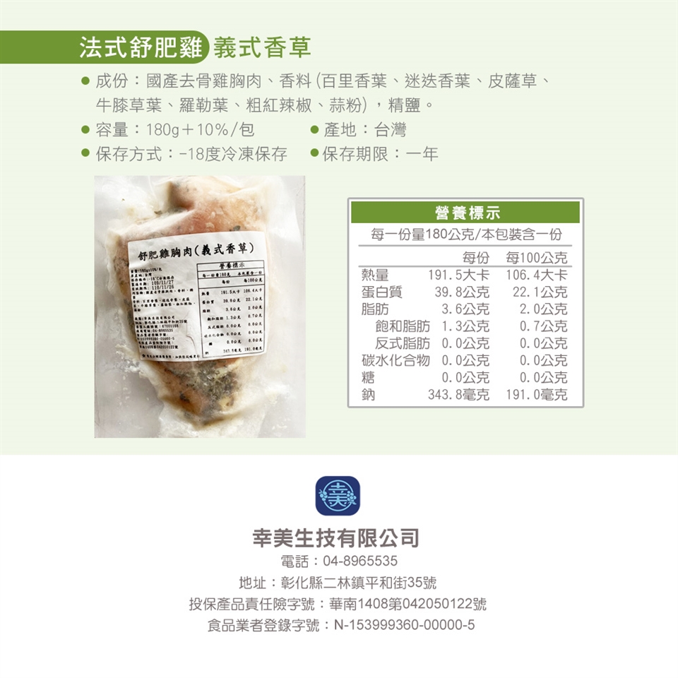 1.商品組合/規格:【幸美生技】超鮮嫩法式舒肥雞胸肉任選12包/川香花椒/印度咖哩/馬告檸檬/義式香草(180g/包)