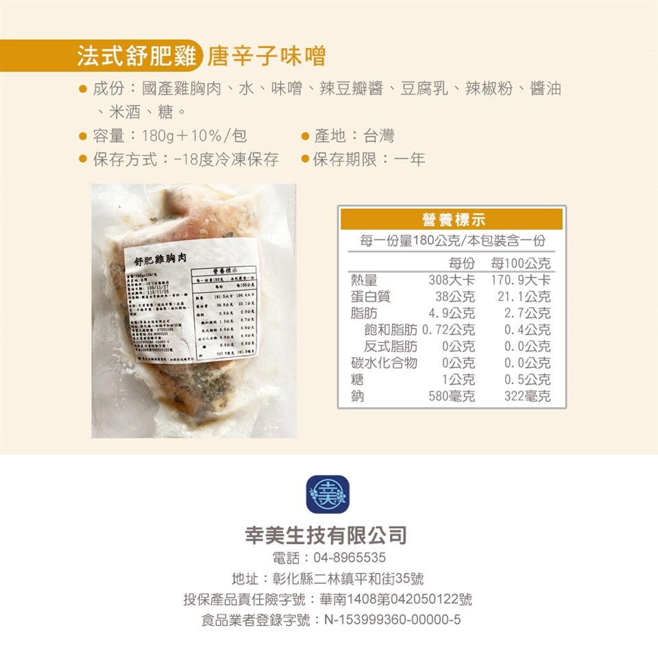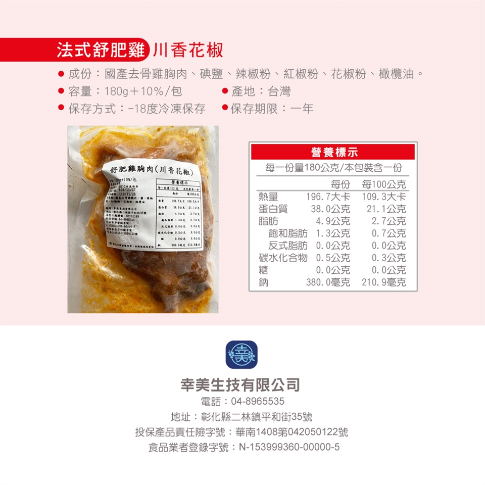 2.商品品名:【幸美生技】超鮮嫩法式舒肥雞胸肉任選12包/川香花椒/印度咖哩/馬告檸檬/義式香草(180g/包)