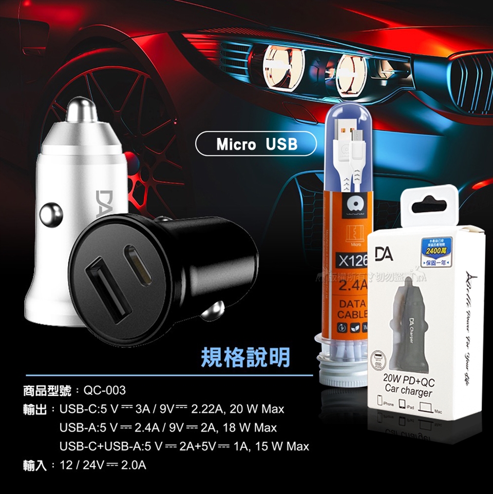 Micro USB 2.4A試管傳輸充電線1M 車用充電組