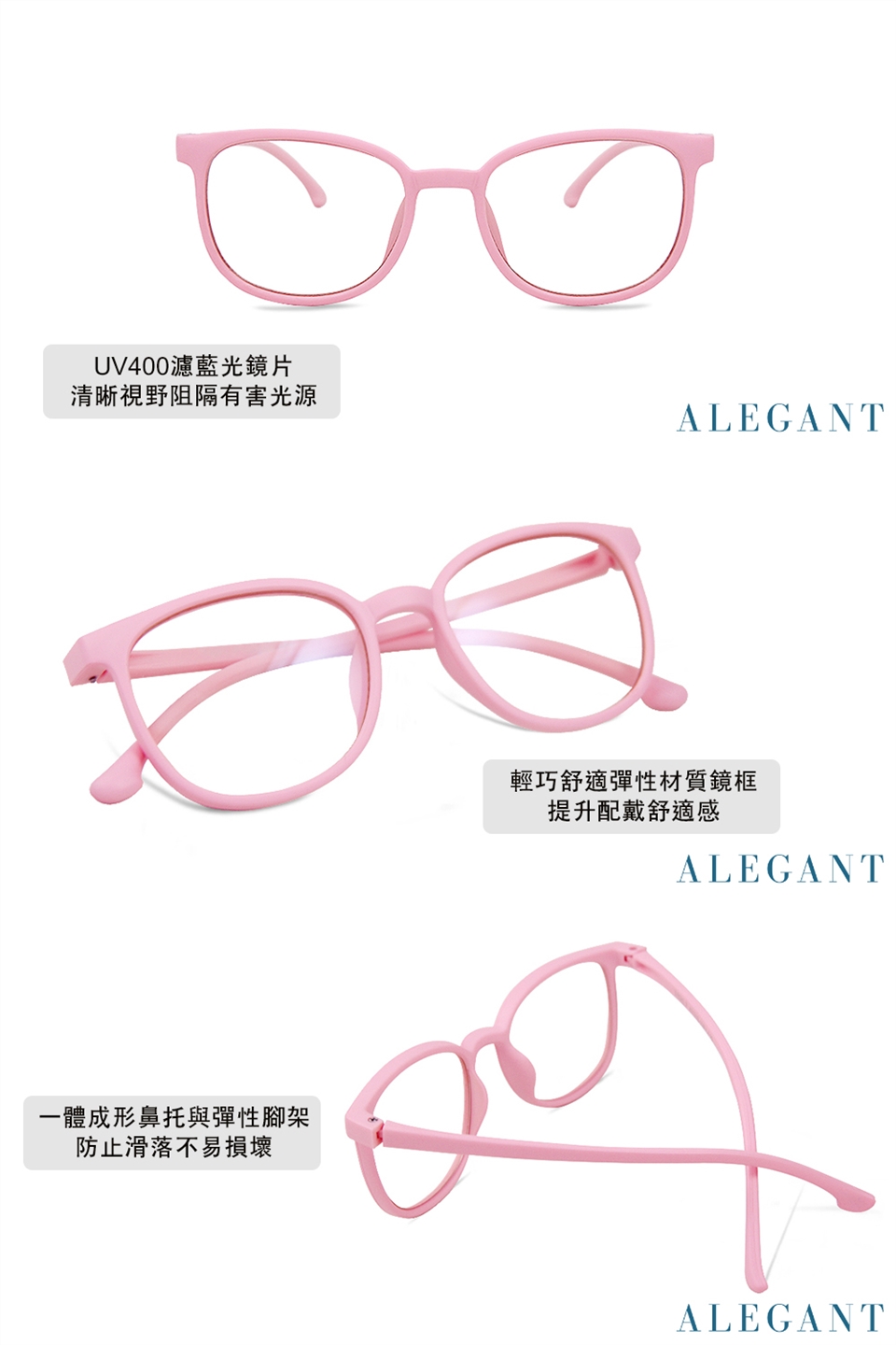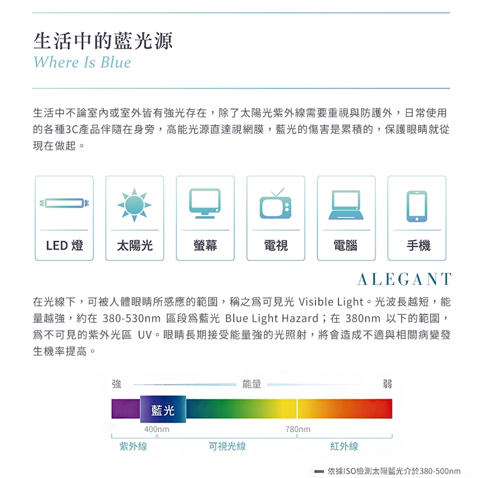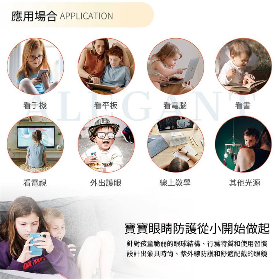 鏡片的材質也相當講究!ALEGANT濾藍光鏡片可阻擋UVA、UVB紫外線,抗UV400對抗炎炎夏日的紫外線。現在的太陽光越來越毒,紫外線超標,強烈光線照射入眼睛中,首先會經過水晶體這個屏障,但水晶體要在發育的過程中才會慢慢變黃以達到隔絕紫外線的功能。小朋友水晶體在出生時是透明的,10 歲前若沒有做好眼睛保護,脆弱的水晶體就會吸收太多紫外線,未來可能提早產生白內障,所以要儘早為小朋友做好做好防護,給孩子一個健康快樂的童年 !