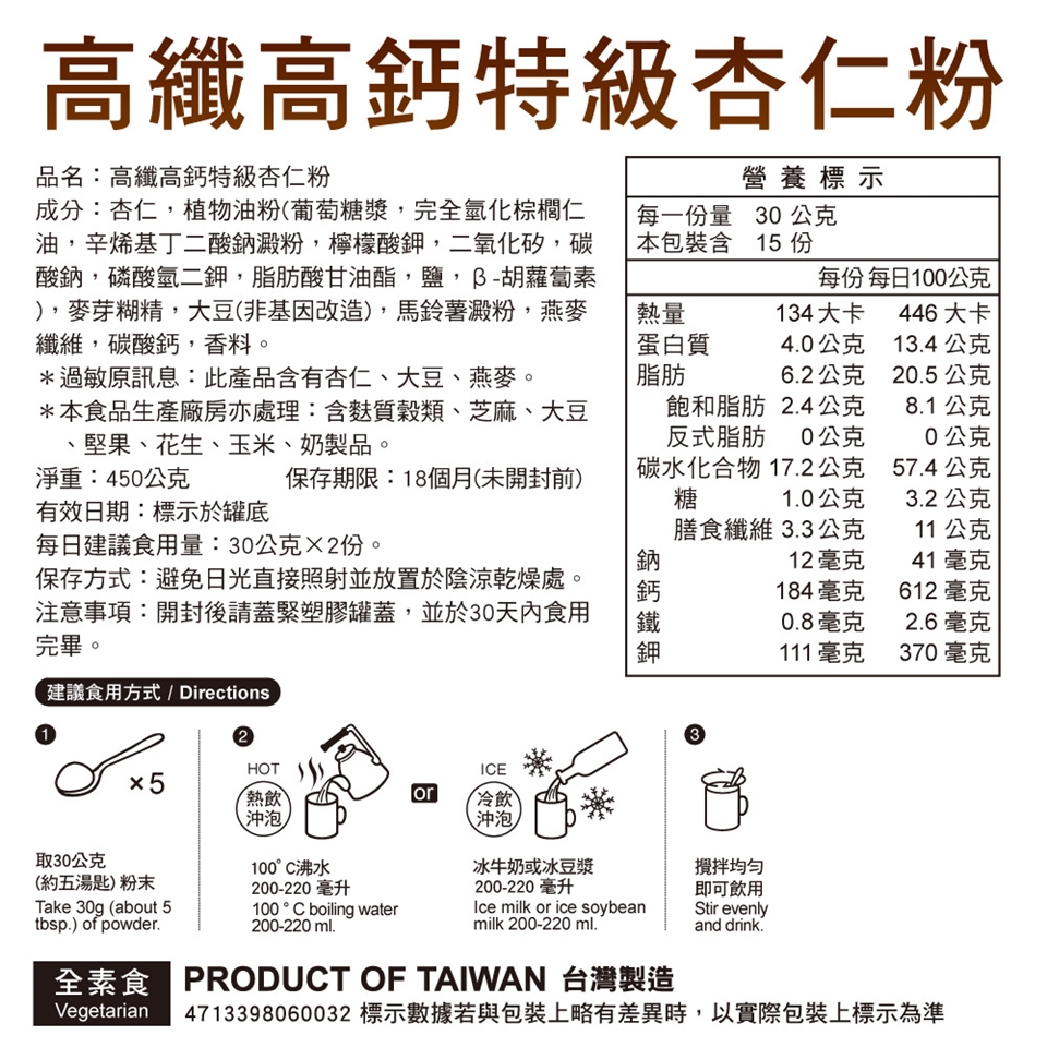 取30g(約兩匙),依個人喜好加入200~220ml 沸騰熱水、豆漿,鮮奶,攪拌均勻即可食用