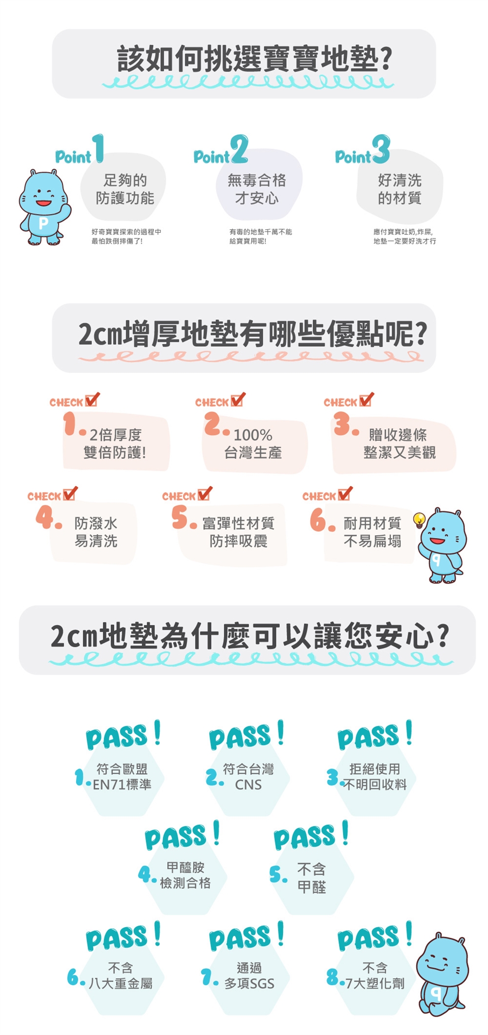 研究指出孩童接觸塑化劑將阻礙其發展甚至造成發育功能障礙,選擇無塑化劑的地墊對幼童才有保障,塑化劑那麼多種!新生活家一次幫您做到測底把關!地墊皆通過八大塑化劑檢測:鄰苯二甲酸甲苯基丁酯(BBP)、鄰苯二甲酸二丁酯(DBP)、鄰苯二甲酸二(2-乙基己基)酯(DEHP)、鄰苯二甲酸二異癸酯(DIDP)、鄰苯二甲酸二異壬酯(DINP)、鄰苯二甲酸二正辛酯、(DNOP)鄰苯二甲酸二甲酯(DMP)、鄰苯二甲酸二乙酯(DEP)。