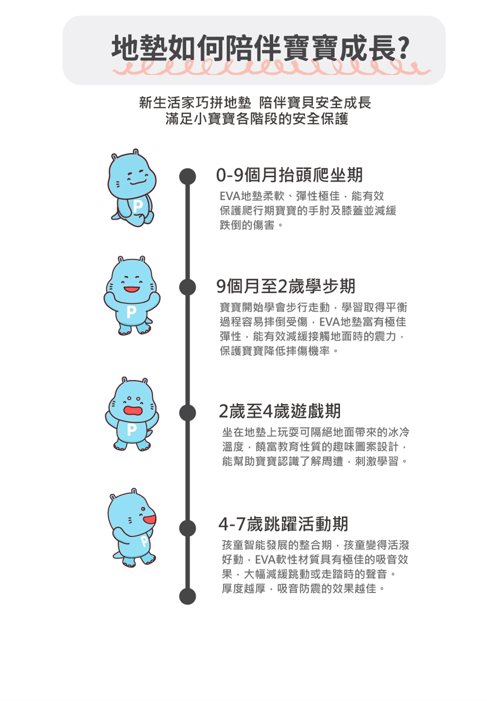 緩衝: EVA地墊富有極佳的彈性,能有效減緩接觸地面時的震力,可保護孩童及年長者,降低跌倒、碰撞到堅硬地面時所造成的傷害。