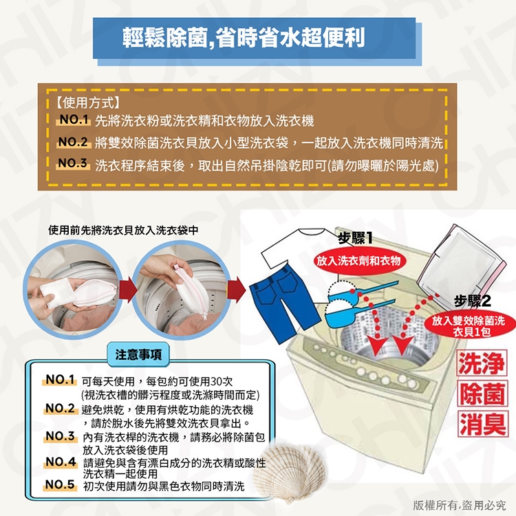 - 洗衣機內有洗衣桿的洗衣機,請務必將雙效除菌洗衣貝放入洗衣袋內使用