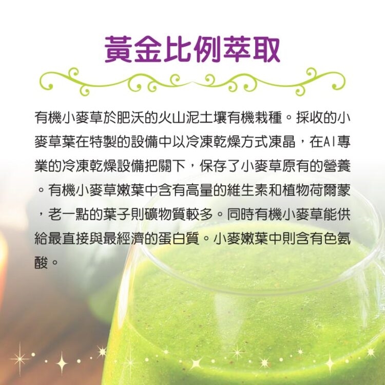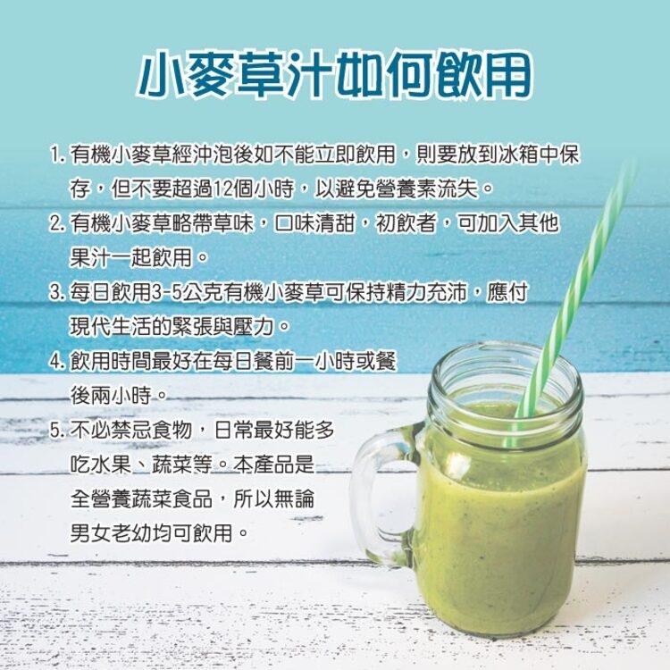 食用方式:早上空腹或每日餐前,加入1-3匙(1匙約1公克)有機小麥草粉加入250ml(建議溫度不超過40℃)溫冷開水、果汁或蜂蜜水中攪拌均勻後飲用。