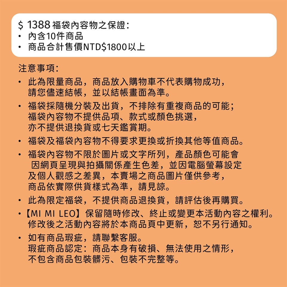 •福袋採隨機分裝及出貨,不排除有重複商品的可能;福袋內容物不提供品項、款式或顏色挑選,亦不提供退換貨或七天鑑賞期。