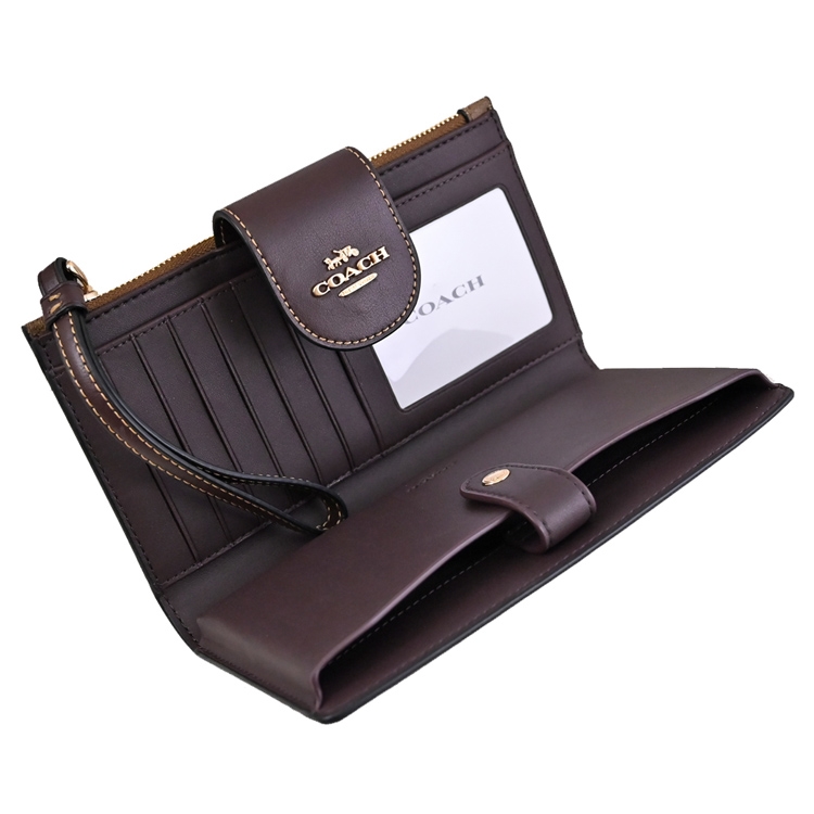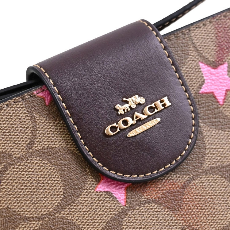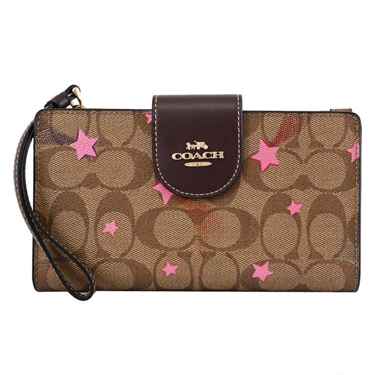 COACH 專櫃商品,熱銷時尚手提式長夾,浮雕金屬馬車LOGO加上滿版C LOGO PVC與星形印花拼接/內襯皮革材質,扣式開口/內有6信用卡夾+1透明夾層+1貼袋+1拉鍊袋+1手機袋(可容納6.1吋以下手機)等供收納,是款耐髒耐用的實用單品配件。