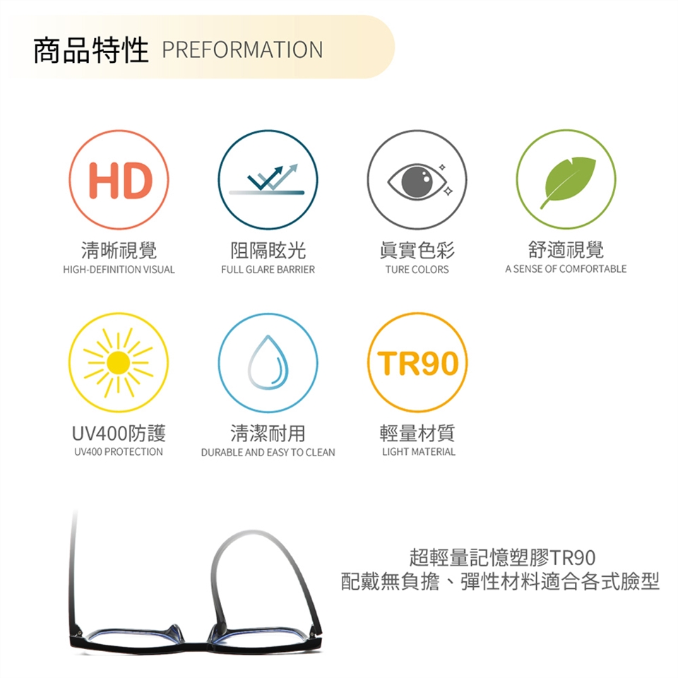 UV400阻隔紫外線傷害,濾除刺眼的藍光,防止眼睛疲勞,鏡架輕軟Q彈超好戴,上學或休閒,適於用眼過度的新世代。