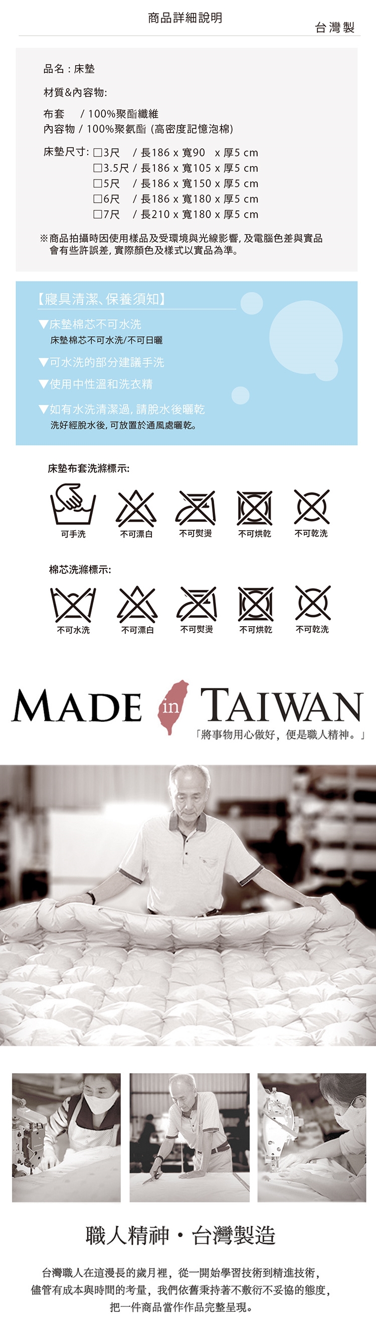※床墊布套:可手洗、不可漂白、不可熨燙、不可烘乾、不可乾洗。