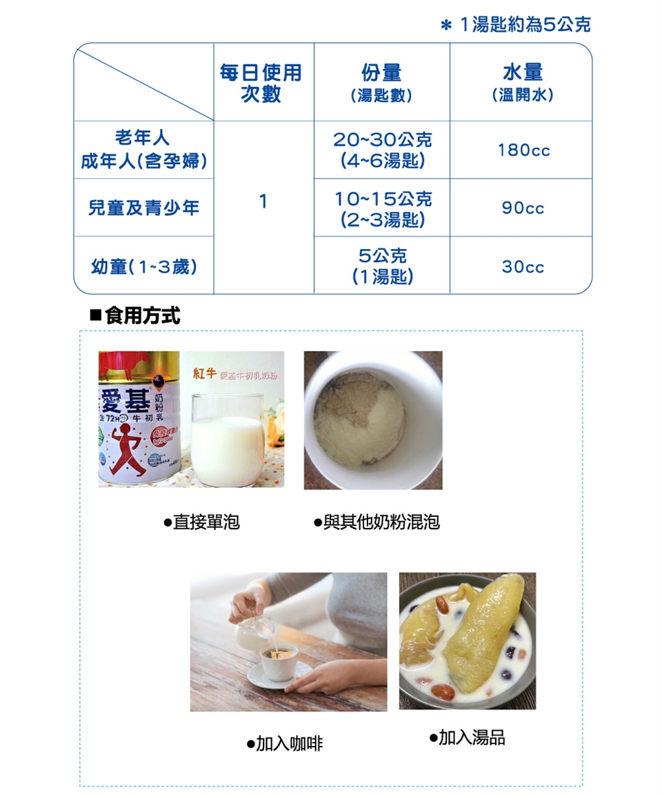 商品詳細介紹 體驗說明 不可體驗 使用方法說明 先將4湯匙(約20公克)紅牛初乳奶粉,加入180毫升的溫開水,攪拌均勻至奶粉完全溶解即可飲用。請使用55C以下飲用溫水沖調,避免營養素流失與破壞。 注意事項 請放置陰涼處保存