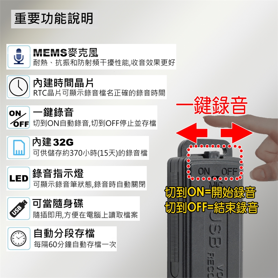 ◆32G大容量記憶體,可錄音存檔370小時(約15天),同時可當隨身碟使用。