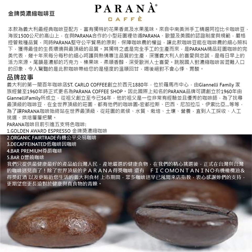 因此國際上知名的PARANA品牌可謂創立於1960年,由Giannelli Family所成立,從祖父創立至今已56年,他的祖父是一位非常有經驗並且優秀的咖啡師,為了找尋最頂級的咖啡豆,在全世界頂級的莊園,都有他們的咖啡園-宏都拉斯、巴西、尼加拉瓜、伊索比亞…等等,為了讓PARANA咖啡始終站在世界最頂級,從莊園的氣候、水質、栽培、土壤、營養,直到人工採收、人工挑選、烘培層層把關。PARANA咖啡連續兩年獲得歐洲咖啡評鑑協會金牌獎,在國際上已經是個非常知名的品牌,累積了非常多的好口碑。