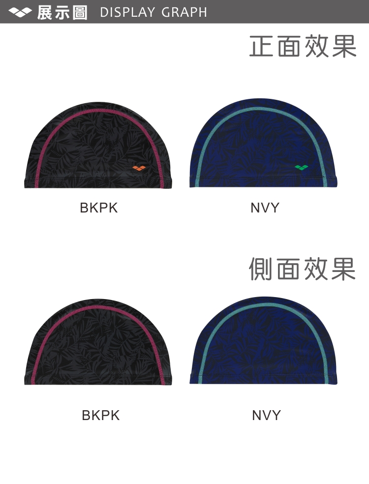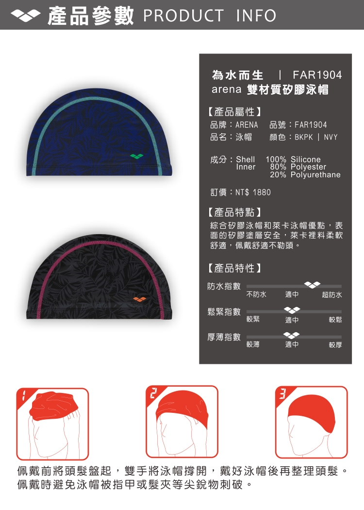 配戴方法: 佩戴前將頭髮盤起,雙手將泳帽撐開,戴好泳帽後再整理頭髮。
