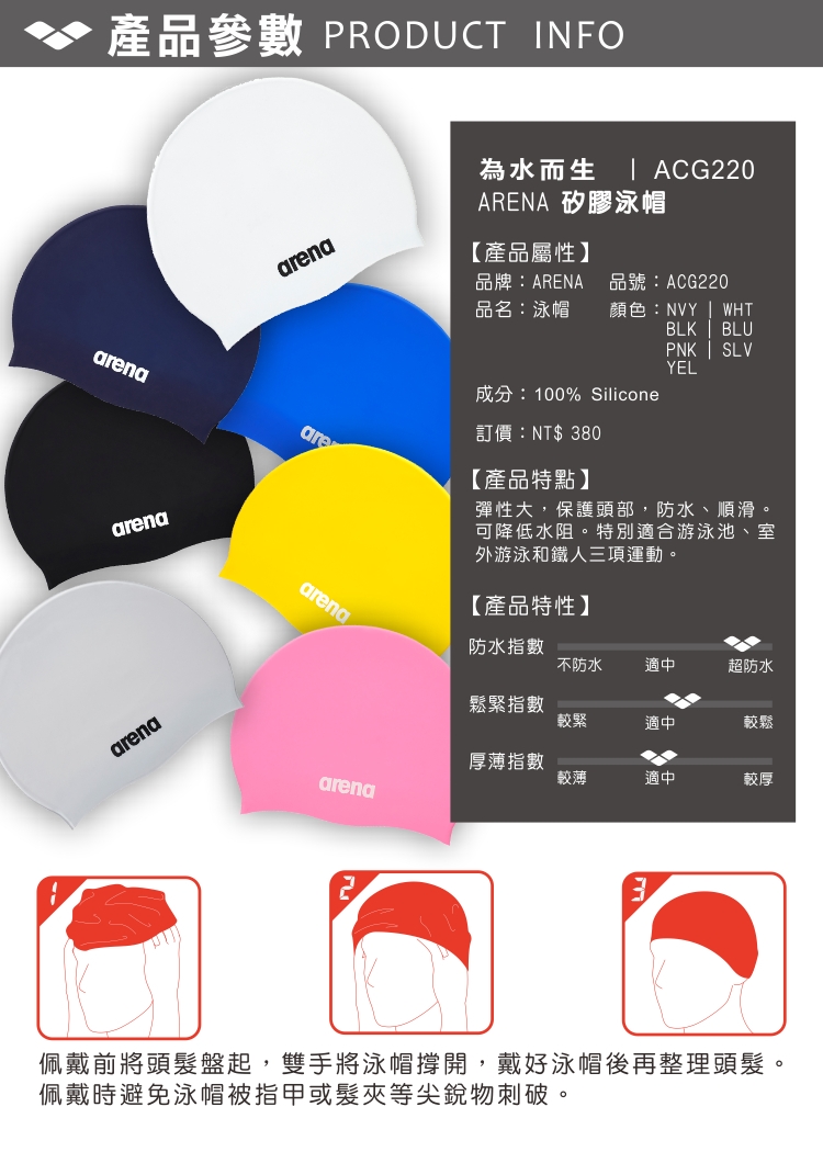 配戴方法: 佩戴前將頭髮盤起,雙手將泳帽撐開,戴好泳帽後再整理頭髮。