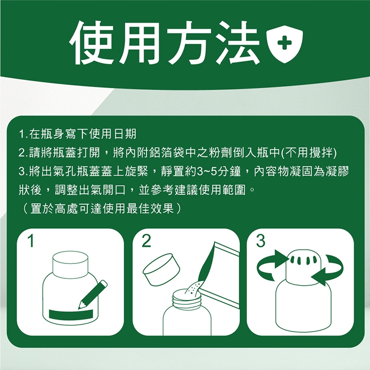 3.將出氣孔瓶蓋蓋上旋緊,靜置約3~5分鐘,內容物凝固為凝膠狀後,調整出氣開口,並參考建議使用範圍。(置於高處可達使用最佳效果)