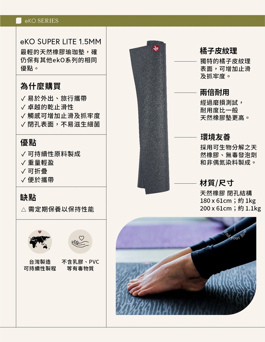 - 由可持續採伐的樹膠製成的天然瑜珈墊。