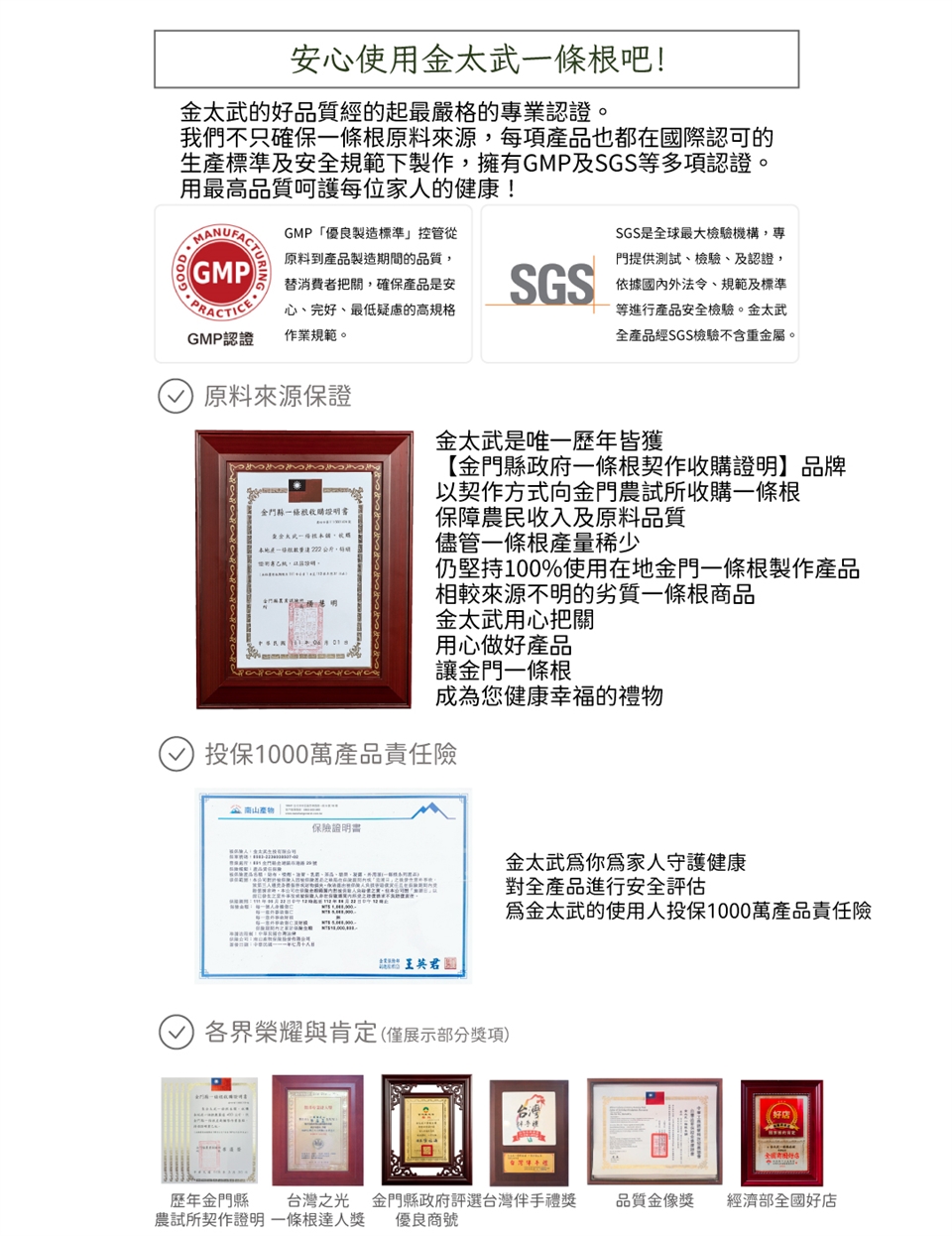 金太武為歷年皆獲金門縣政府農試所契作認證品牌,品質優良