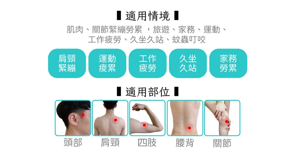 深層舒緩家事勞累、工作疲勞、運動前後、手機/電腦族肩頸不適等日常疲勞