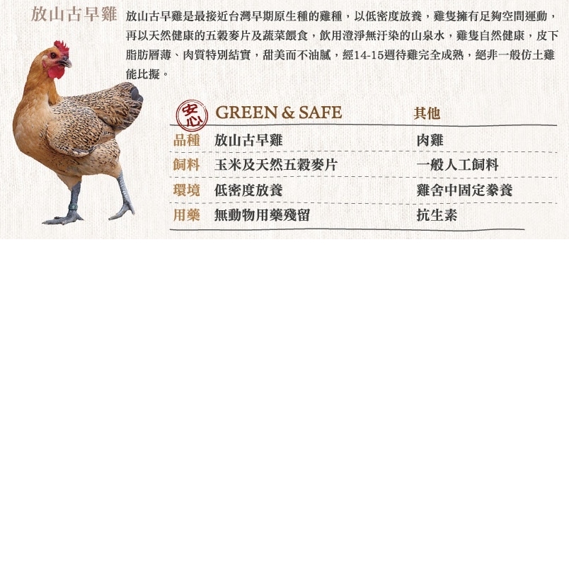 Green&Safe 永豐餘生技的放山古早雞,生長於中南台灣廣闊的田區,以低密度放養,且以天然健康五穀麥片及蔬菜餵食,讓放山古早雞有足夠的空間運動,因此皮下脂肪層薄,肉質特別結實甜美而不油膩,絕非一班雞隻可比擬。此外,相較於一般土雞,飼主為了管理方便而剪喙避免互喙。Green&Safe 的放山古早雞,保有天生自然的野性,喜好四處覓食,因此抗病力強加上飼養於天然純淨無汙染的水源地,雞隻自然健康,經 14-15 週完全成熟,絕不施打生長激素。