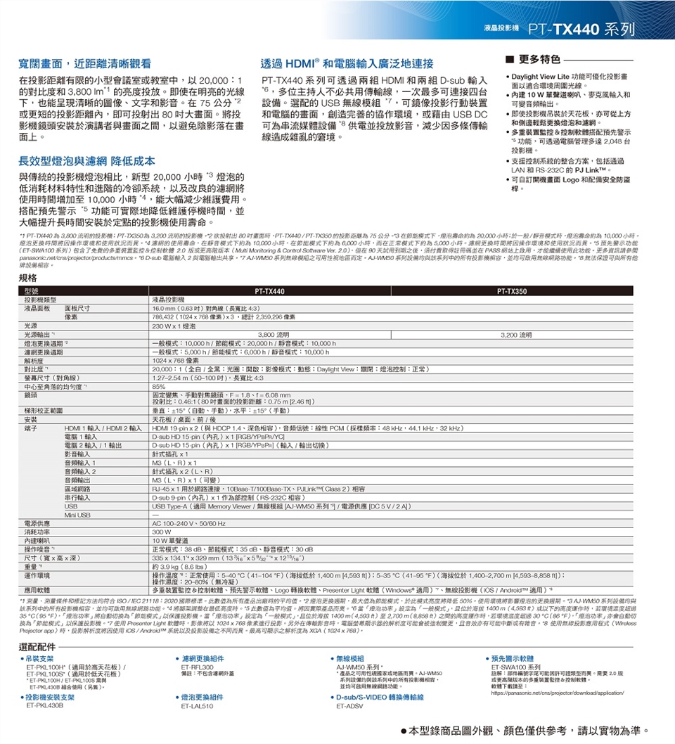 【商品名稱】Panasonic國際牌 PT-TX350 3200流明 XGA短焦投影機
