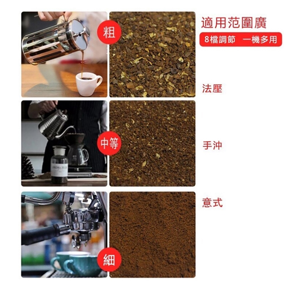 喜好或所使用的咖啡器具調整至所需的號碼,控製出粉粗細。