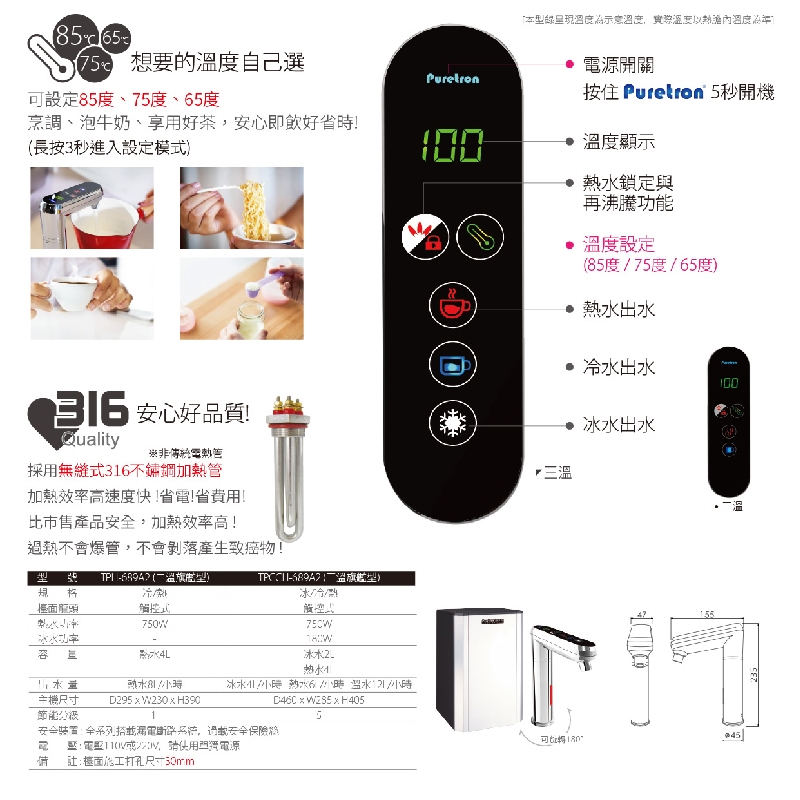 【普立創PURETRON】TPH-689A2/TPH689A2觸控型溫控櫥下熱飲機/冷熱雙溫飲水機【最新款】