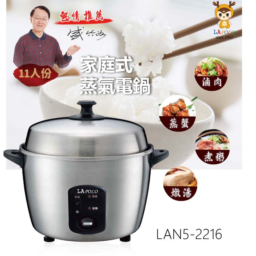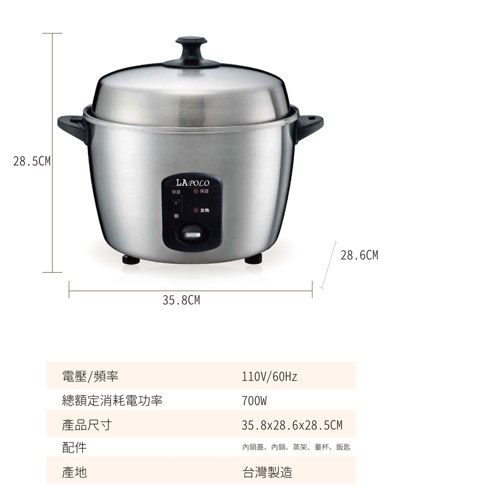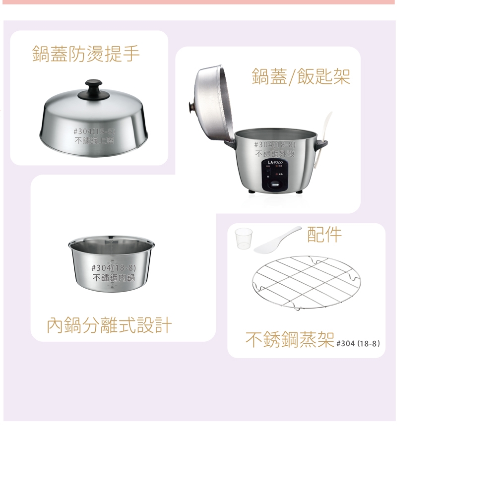 ◆ 電鍋上蓋、內鍋、中鍋(放水加熱的部分)、電鍋外殼、蒸架皆為不鏽鋼製品