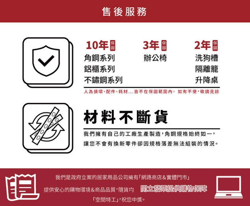 5》免費保固範圍包含本體扭曲或凹陷、結構損壞,以上若有人為損壞皆不保固,令不保固本體之外損壞,如掉漆與髒汙。