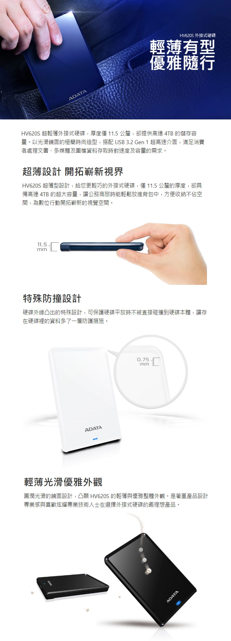 ADATA 威剛|HV620S 4TB 2.5吋行動硬碟(黑)
